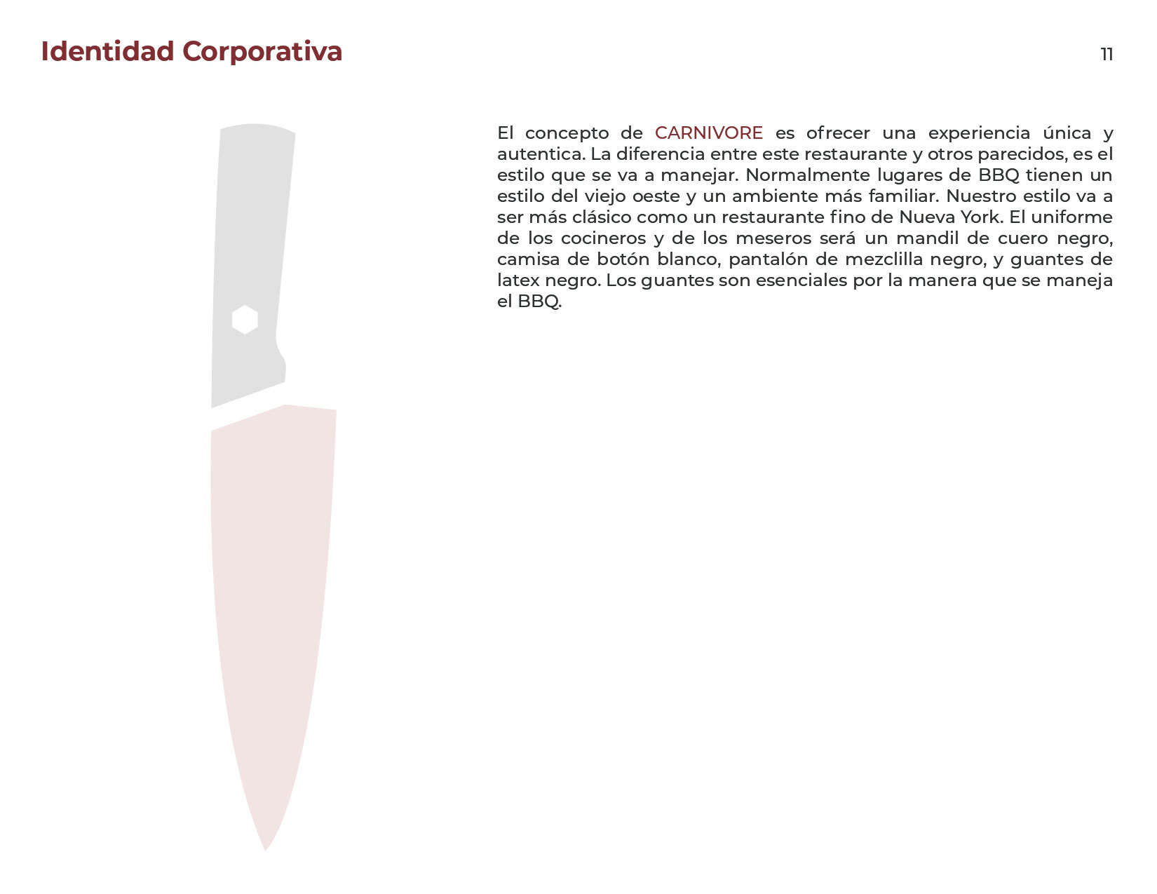 the logo design for this bbq restaurant, located in guadalajara, mexico, adheres to a prescribed criteria regarding brand identity mandated by the market where it is located. the criteria required that the restaurant identity be created around the existing identity of the market which only uses helvetica in its signage. i was able to find a font that complements the established aesthetic without sacrificing originality. the most noticeable element of this logo is that the letter ‘i’ is substituted for a chef’s knife. the dark red of the knife is the only color in the design, it represents the color of the meat used in the type of bbq that is served at the restaurant. the black of the remaining letters represents both charred wood and the smoke it releases that is vital to the cooking process of this cuisine.